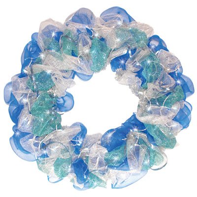Dekra-Lite Seaside Mesh Wreath Size: 4′ 10 Watts 100 Cool White LED Bulbs Blue, Teal, and Silver Mesh with Glitter Bands Twinkles Additional Information: Celebrate the holidays with this unique spin on traditional Christmas wreaths. Brightly colored mesh wraps, curls and weaves to create a whimsical look in traditional Christmas pallets. 4′ Seaside Mesh Wreath – Blue, teal and silver mesh with glitter bands 10 watts, 100 cool white LED twinkle bulbs