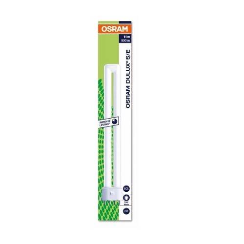 Osram #017662 Dulux S/E 11W 900lm Lumilux Interna 2G7 4-pin Compact Fluorescent Lamp Replaces Dulux S/E 11W/41-827 & Used In Offices,Pubic Building,Hotels, restaurants,Etc Product Details Initial Lumen 900  2G7 (4-Pin) Base Rated Wattage 11W Rated Avg.Life 20,000hrs MOL 214mm x DIA 12mm UPC Code 4050300017662 Generic CFT11W/2G7/827 Color Temp 2700k (Lumilux Interna)   Additional Info Osram Dulux S/E 11W can be operated with battery, solar and mains power. They are suitable for high and low voltage operation, e.g. with Accutronic. Furthermore they are fully dimmable. In design and performance they correspond to proven OSRAM DULUX S basic models. In ECG operation mode, lifeftime is ten times longer than incandescent light bulbs of the same brightness ECG operation provides high degree of lighting comfort Small dimensions, extremely shallow Very small power unit for solar or battery operation (emergency power) Low power consumption Luminous flux versions from 250 to 900 lm Single-ended, 4-pin plug-in 2G7 base Very economical Good quality of light Excellent luminous efficiency Extremely low profile Long service life