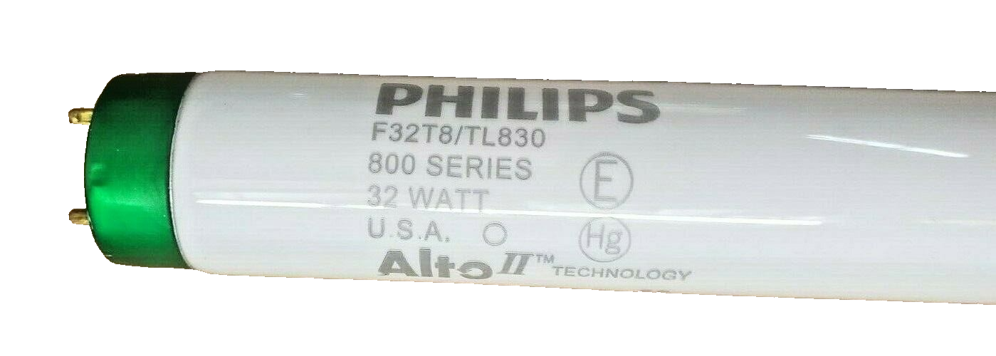 // Philips 800 Series Energy Saving 32W Alto 3000K T8 Linear Fluorescent Tube CRI 85 MOL 48in x DIA 1in Initial Lumens 2850 Mean Lumens 2710 Rated Avg. Life 24,000-36,000hrs G13 Medium Green Base Philips Order Code #28151-9 Color Temp 3000K (TL830) CCT of 3000K (Warm White) UPC #46677281519 Sold 30/Case Additional Information: 95% lumen maintenance and reduced lamp-end blackening Reduce maintenance costs by extending the relamping cycle This bulb meets Federal minimum efficiency standards. Only 1.7mg of mercury per lamp with ALTO II Applications: Restaurant Lighting Retail Lighting Office Lighting Healthcare Lighting Contractor Lighting